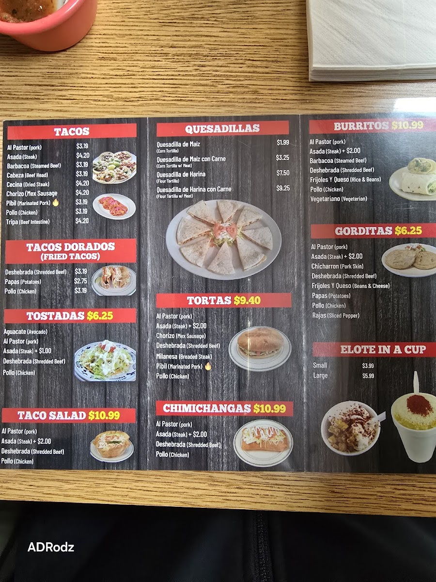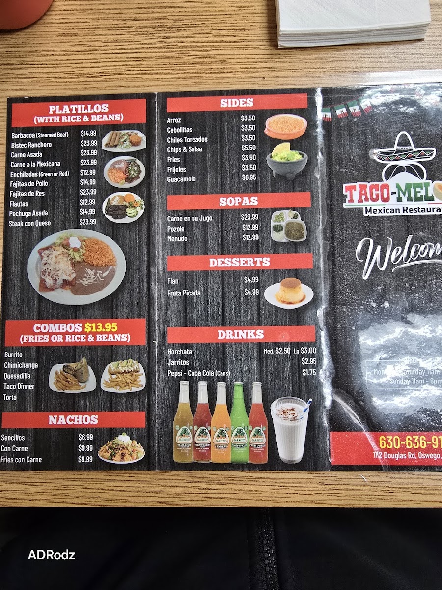 From the perspective of a reviewer, Taco-Melon Mexican Restaurant at 1112 Douglas Rd, Oswego, IL, offers a menu that is both extensive and authentic, showcasing a wide array of traditional Mexican dishes. The burritos lineup impresses with options like Burrito Cabeza/Beefhead, Burrito Barbacoa, Burrito Chorizo, Burrito Veggie, and Burrito Asada/Steak, catering to both meat lovers and vegetarians. Their platillos/dinners, which come with rice and beans, include flavorful selections such as Bistek Ranchero, Chimi Dinner, Pechuga Asada, Enchiladas, and Fajitas De Res. For tamale enthusiasts, choices like Chicken Tamales, Veggie Tamale, and Pork Tamale are available. The combo meals, including Taco Combo, Quesadilla Combo Carne, Chimi Combo, Burrito Combo, and Torta Combo, make it easy to enjoy multiple favorites at once. Taco aficionados can indulge in Cochinita Pibil, Cabeza, Chorizo Dorados Desebrada, and Pastor/Pork, while the tostadas menu features options like Tostada Aguacate, Tostada Desebrada/Beef, Tostada Pollo/Chicken, Tostada Asada/Steak, and Tostada Cabeza/Beefhead.