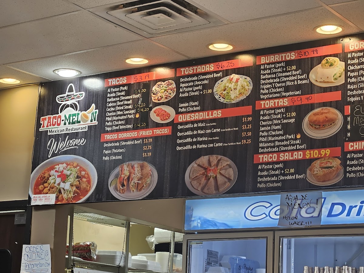 Other highlights include chimichangas such as Chimi Aguacate/Avocadoe, Chimi Asada/Steak, Vegetarian Chimi, Chimi Chorizo, and Chimi Pollo/Chicken, and hearty taco salads like Taco Salad Cabeza/Beefhead, Taco Salad Chorizo, Taco Salad Pollo, and Taco Salad Al Pastor/Pork, alongside a Vegetarian Salad. The quesadillas and gorditas sections offer crowd-pleasers like Quesadilla Harina Grde, Corn Quesadilla, Gordita Chicharron, Gordita Cabeza/Beefhead, and Gordita Al Pastor/Pork. Breakfast lovers can enjoy Breakfast Burrito, Breakfast Torta, Huevos Con Tocino, Chilaquiles, and Huevos Ala Mexicana. For sides and snacks, the menu includes nachos, fries, beans, guacamole, and beverages like Mexican Coke, coffee, and aguas frescas. Catering options, including Half Tray Of Rice Or Beans, Full Tray Rice Or Beans, and Taco Bar Catering, make it a versatile choice for larger gatherings. Overall, Taco-Melon delivers a menu that is rich in variety, authentic flavors, and satisfying portions, making it a dependable spot for both casual meals and special occasions.
